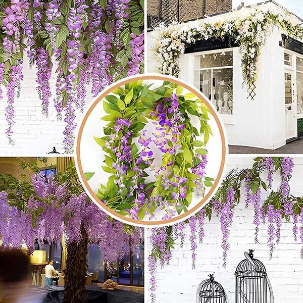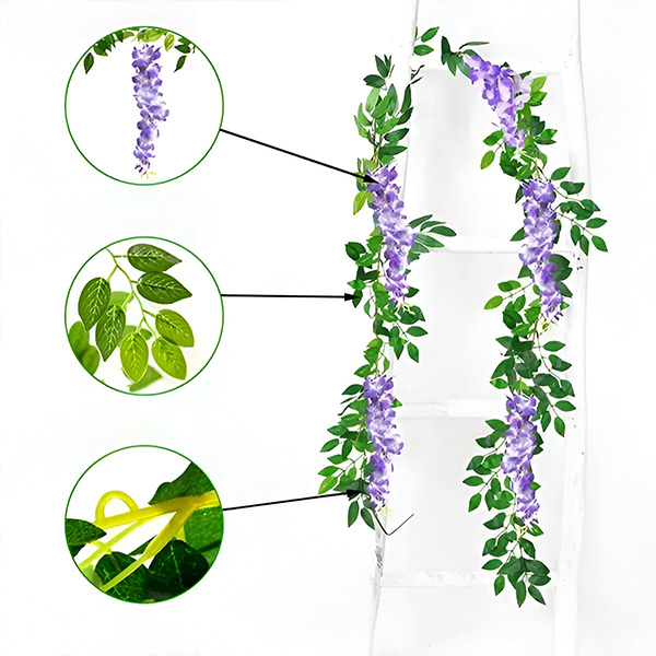 Heb je genoeg van het onderhoud van echte bloemen die verwelken en vervagen? WISBLOOM is een imitatie van blauwe regen met klimopblaadjes die een vleugje natuurlijke schoonheid in je ruimte brengen zonder gedoe. Deze levendige, levensechte hangende bloemen blijven jaar na jaar fris en kleurrijk, zodat je tuin of huis er altijd prachtig uitziet.