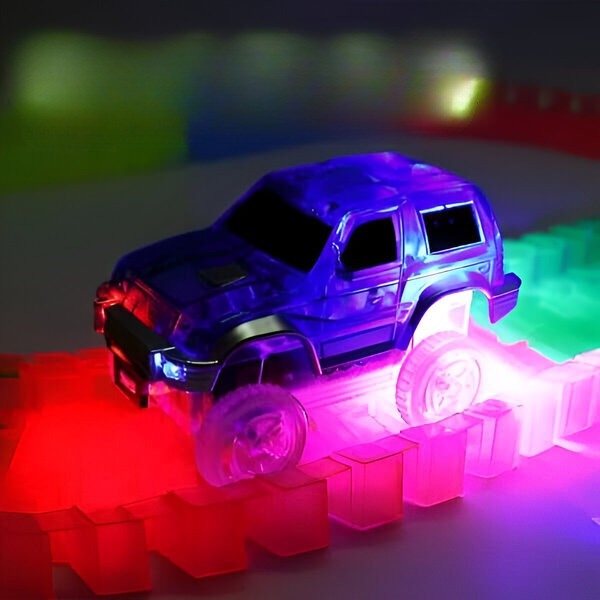 Zie hoe de baan en de auto in het donker oplichten, wat een betoverend spektakel creëert dat de speelervaring verbetert.