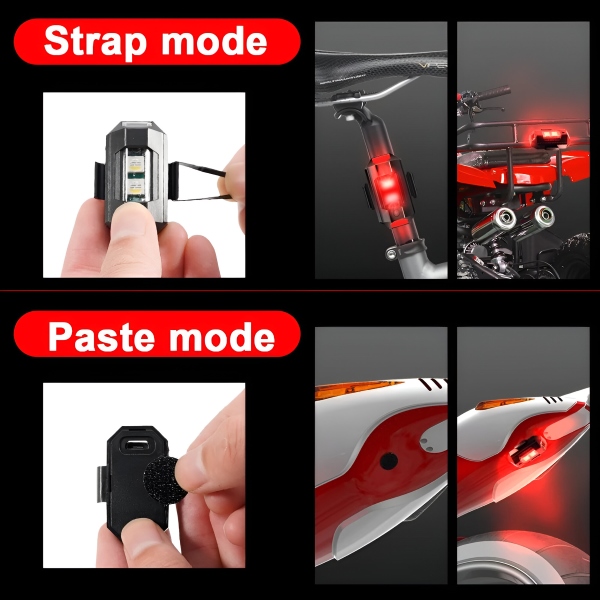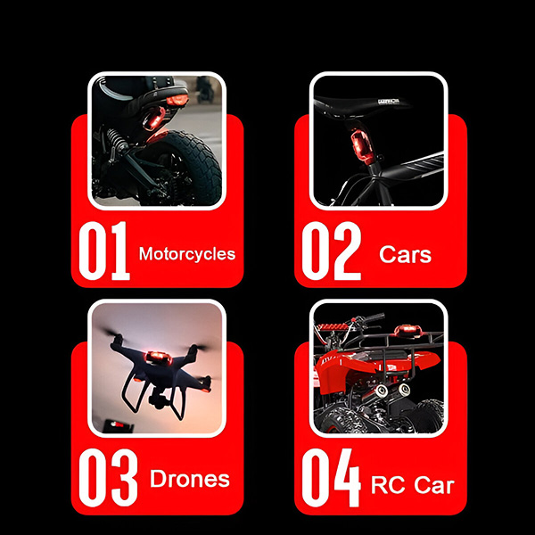 Deze lampen zijn ongelooflijk veelzijdig en ontworpen voor auto’s, motorfietsen, fietsen en drones. Kies tussen installatiemethoden met klittenband en rubberen ringen voor een veilige en eenvoudige installatie. Er zijn geen ingewikkelde hulpmiddelen of professionele hulp nodig.