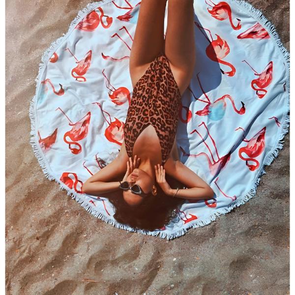 De ronde handdoek is bedoeld om te ontspannen op het strand of bij het zwembad, maar kan ook vastgebonden om het lichaam worden gedragen als kledingstuk.